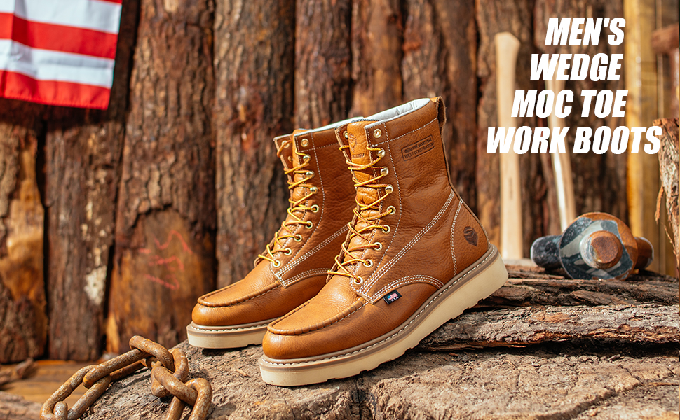 2.Luxury Quality Full Grain Leather:Sureway wedge moc toe work boots use genuine full-grain leather uppers for the perfect blend of ruggedness and softness.Unlike synthetic materials,full-grain leather has natural waterproofing and allows for natural airflow,which helps prevent foot odor and keep feet cool,while also keeping them dry and comfortable in moist environments.Pre Oiled leather develops a more desirable look as it ages gracefully.True to size.Go up half a size if you have a wide feet.