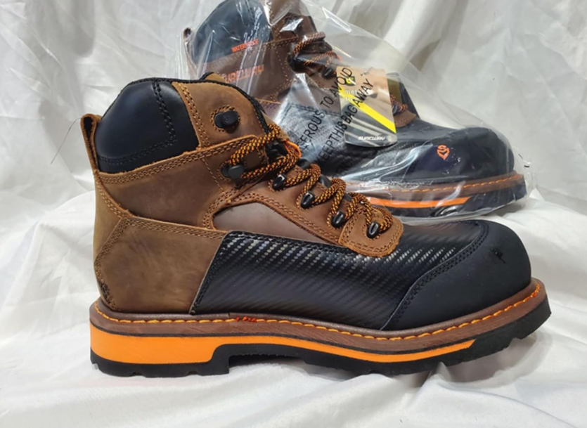 Finally, this Work Boot has style points with its tricolors of black, brown, and orange highlights. The black color has both Matte Black on the toe area and a Semi-Gloss Carbon Fiber (simulated) look along the lower portions’ sides and top of the boot. There are Neon Orange highlights with 360° stitching, base soles, print logos, and lacing. The Tan-Brown leather color is well matched with the offset blacks and orange colors making for a complete boot package that satisfied my taste and comfort requirements.