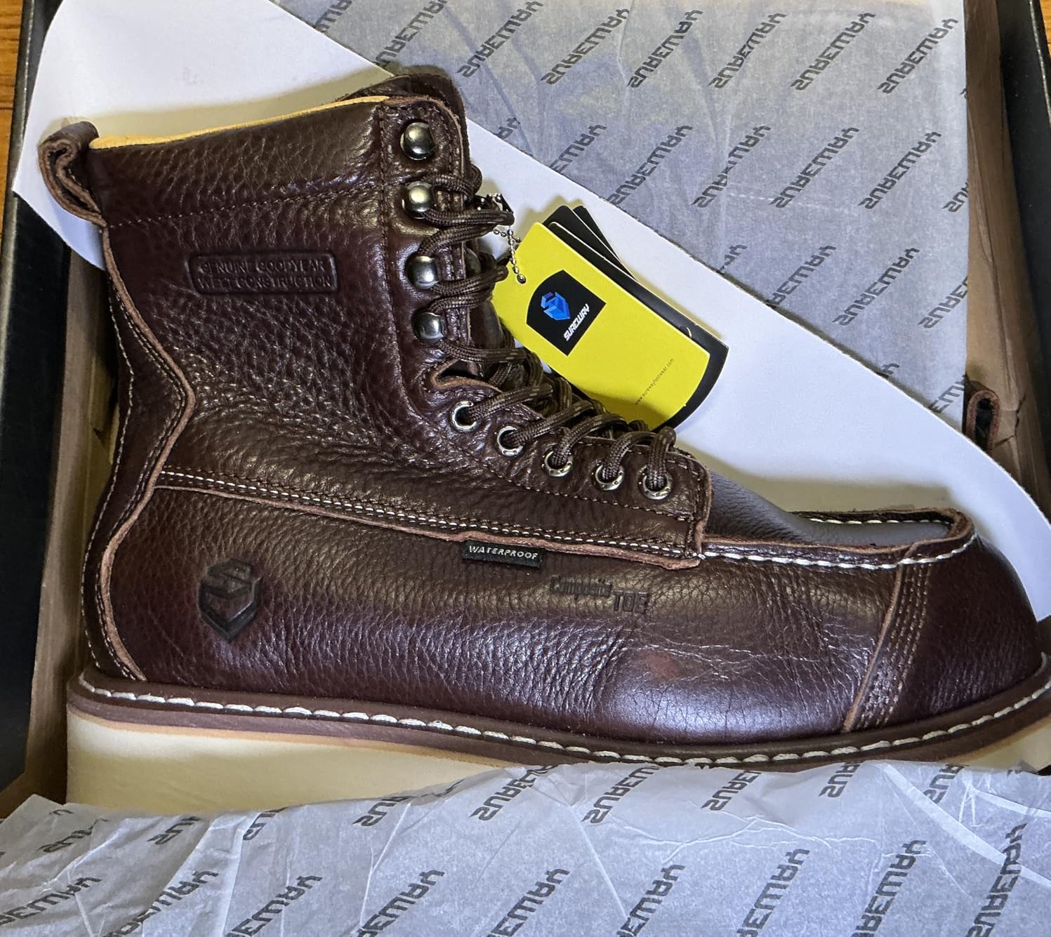 These SUREWAY 8" heavy-duty work boots are a solid pick for my construction shifts, with the composite toe providing reliable protection without the extra weight that slows me down on ladders. The waterproof leather upper kept my feet bone-dry during a rainy pour, shrugging off mud and puddles like a champ. The Goodyear welt construction feels built to last, holding up to daily abuse on uneven sites without cracking or loosening. I appreciate the lace-up wedge moc toe design—it's easy to tighten for a secure fit, and the oil/slip-resistant outsole grips slick concrete or oily floors perfectly, giving me confidence on the job. The EH rating adds peace of mind around electrical hazards, and the cushioned insole supports my arches during 12-hour days. Only downside is they run a bit stiff at first, needing a few wears to break in fully. Overall, they're comfy, durable boots that blend safety and style at a great value!