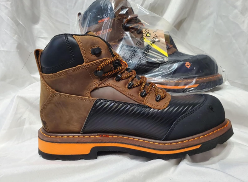 Finally, this Work Boot has style points with its tricolors of black, brown, and orange highlights. The black color has both Matte Black on the toe area and a Semi-Gloss Carbon Fiber (simulated) look along the lower portions’ sides and top of the boot. There are Neon Orange highlights with 360° stitching, base soles, print logos, and lacing. The Tan-Brown leather color is well matched with the offset blacks and orange colors making for a complete boot package that satisfied my taste and comfort requirements.