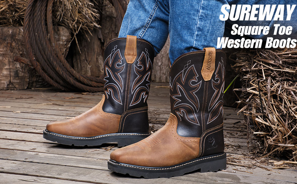 SUREWAY Men Western Boots, Square Toe Leather Cowboy Boot,Pull-On Wellington Soft Toe Work Boots - Brown