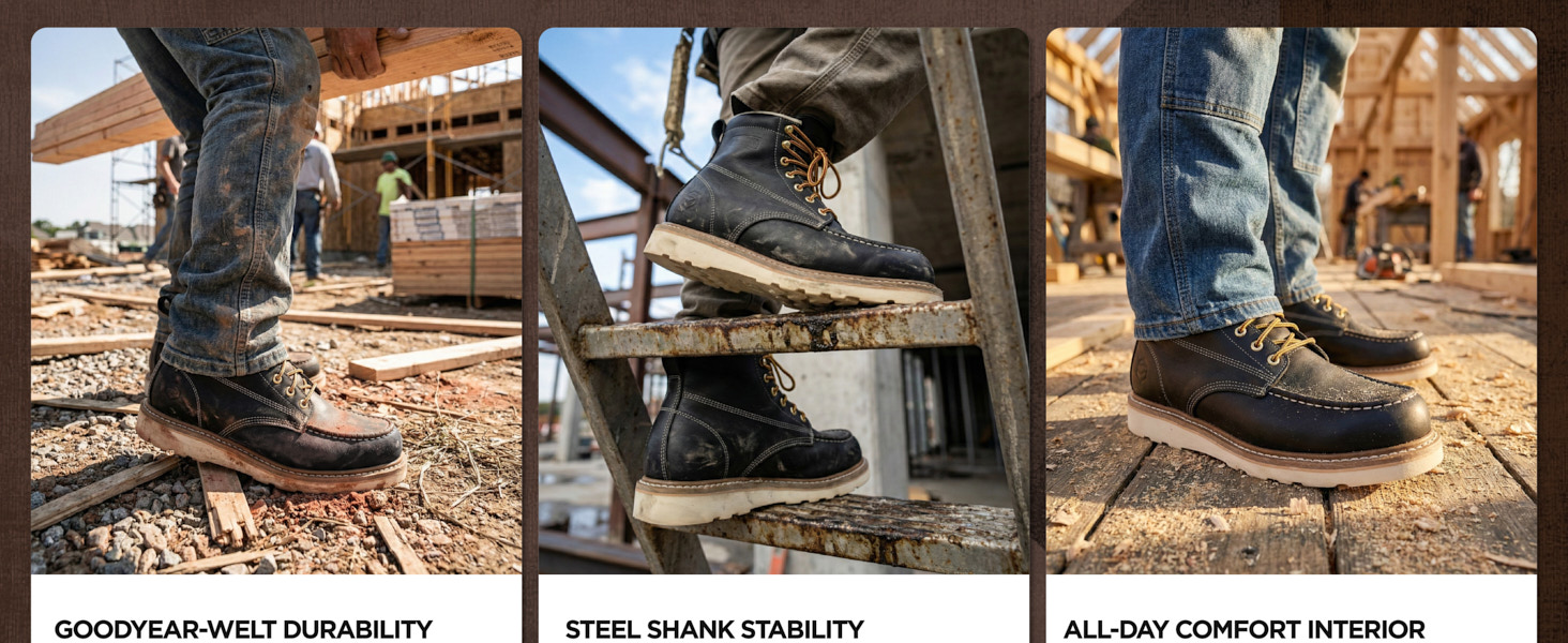 Premium full-grain leather upper, perfect blend of strong and soft. Goodyear welt construction makes the boot rugged and durable. Steel shank for extra sturdiness when climbing stairs or ladders.