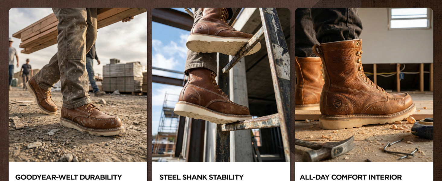 Premium full-grain leather upper, perfect blend of strong and soft. Goodyear welt construction makes the boot rugged and durable. Steel shank for extra sturdiness when climbing stairs or ladders.