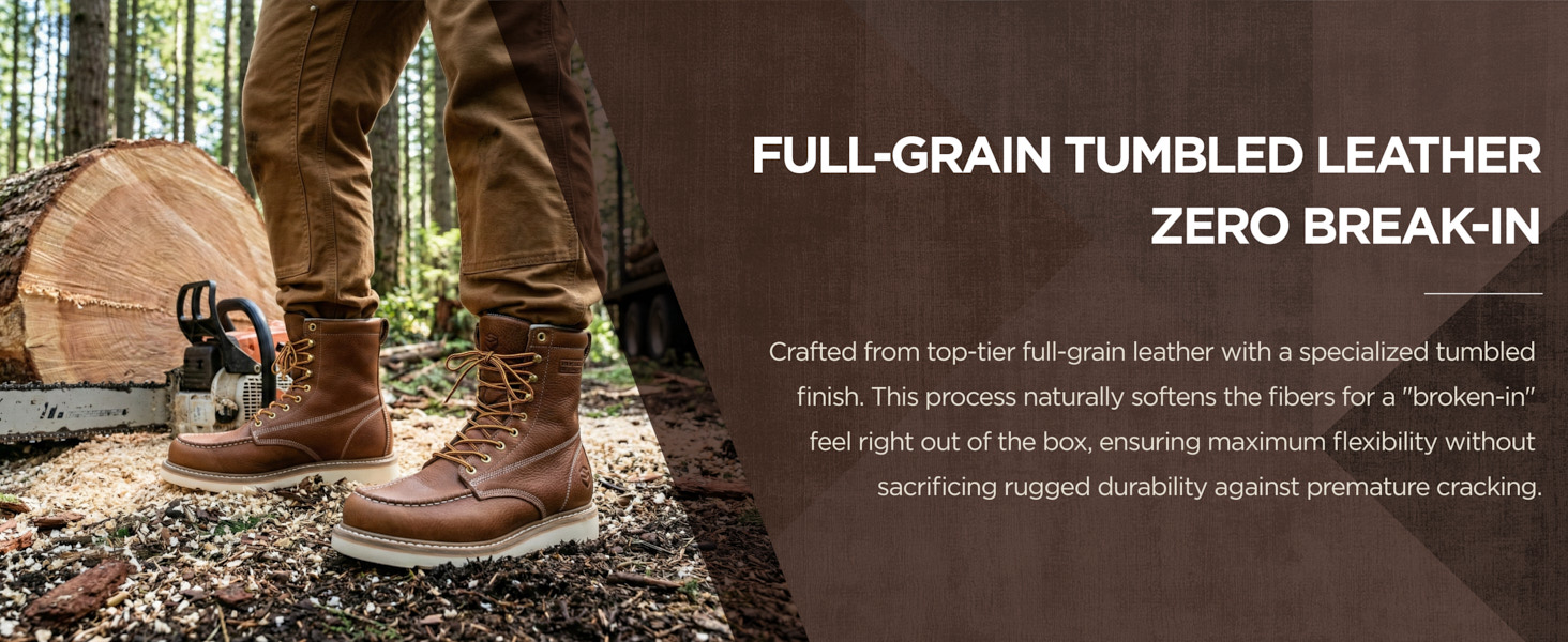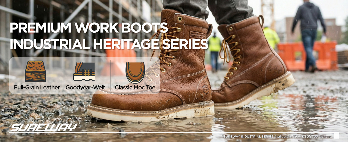 SUREWAY men's work boots use premium full-grain leather upper, perfect blend of strong and soft, makes the boots more resistant to hardening&cracking and hold their shape longer.