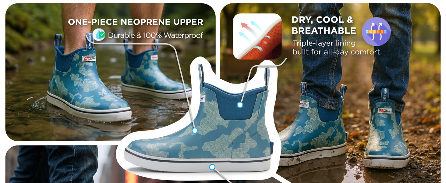 [Great Fishing Gear Choice]Sureway ankle fishing deck boots for men is a perfect choice for any on-the-water athlete looking for protection with slip-on-and-go styling.Fuel your passion with Sureway mens deck boots when you are fishing, sailing, boating, landscaping,gardening or doing sports and a lot more.PLEASE READ THE SIZE CHART AND CHOOSE THE RIGHT SIZE BEFORE BUYING! 6 month Quality Assurance backed by SUREWAY!