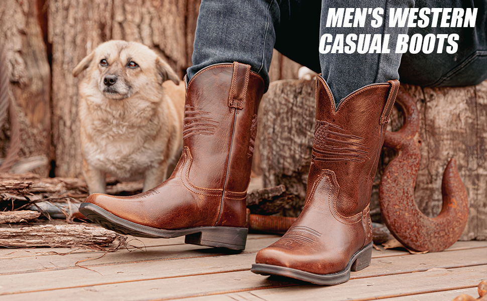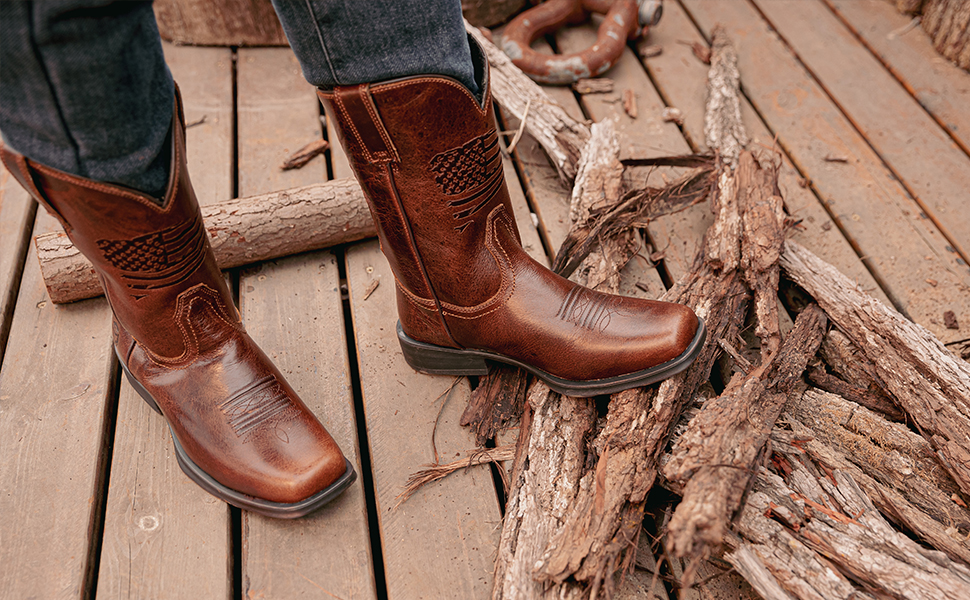 【Durable 100% Imported Leather】Square-Toe Western Boots use genuine imported leather uppers for the perfect blend of ruggedness and softness. Unlike synthetic materials, imported leather has natural waterproofing and allows for natural airflow, which helps prevent foot odor and keep feet cool, while also keeping them dry and comfortable in moist environments. Oil-tumbled leather looks better as time goes by.