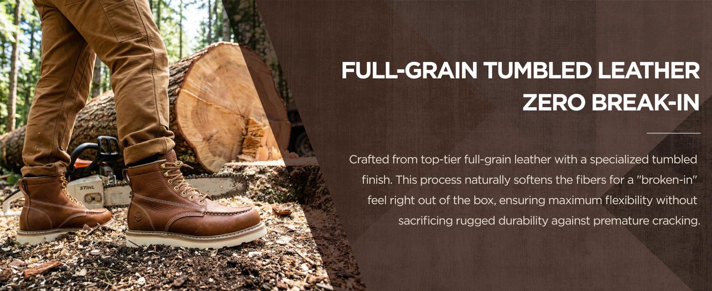 Sureway's 6-inch steel toe work boots feature meticulous Goodyear welt construction—note that no glue is used in the process. They are made with full-grain leather, lined with fabric on the inside, have a padded tongue, and a slip-resistant tread pattern on the outsole. The length of the shoelaces is just right, and there are several quick lace hooks at the top of the boots. These boots provide reliable protection when you need to tackle tough tasks.