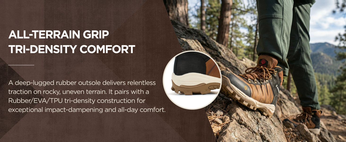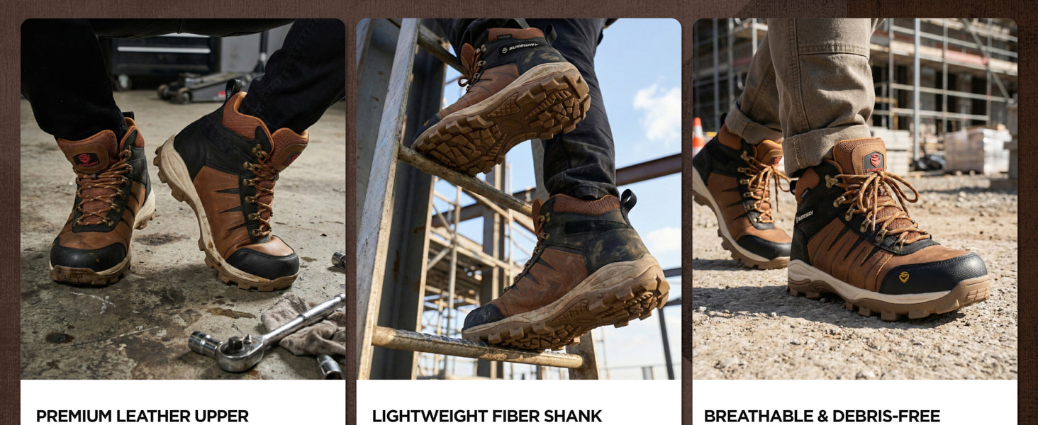 .BREATHABLE ALL-DAY COMFORT | SUREWAY Men Work Boots Breathable waterproof membrane + moisture-wicking mesh lining keeps feet fresh. Removable full-cushioned PU footbed molds to your foot; dynamic compression-resistant midsole delivers long-lasting comfort, with a grippy rubber outsole for steady traction.