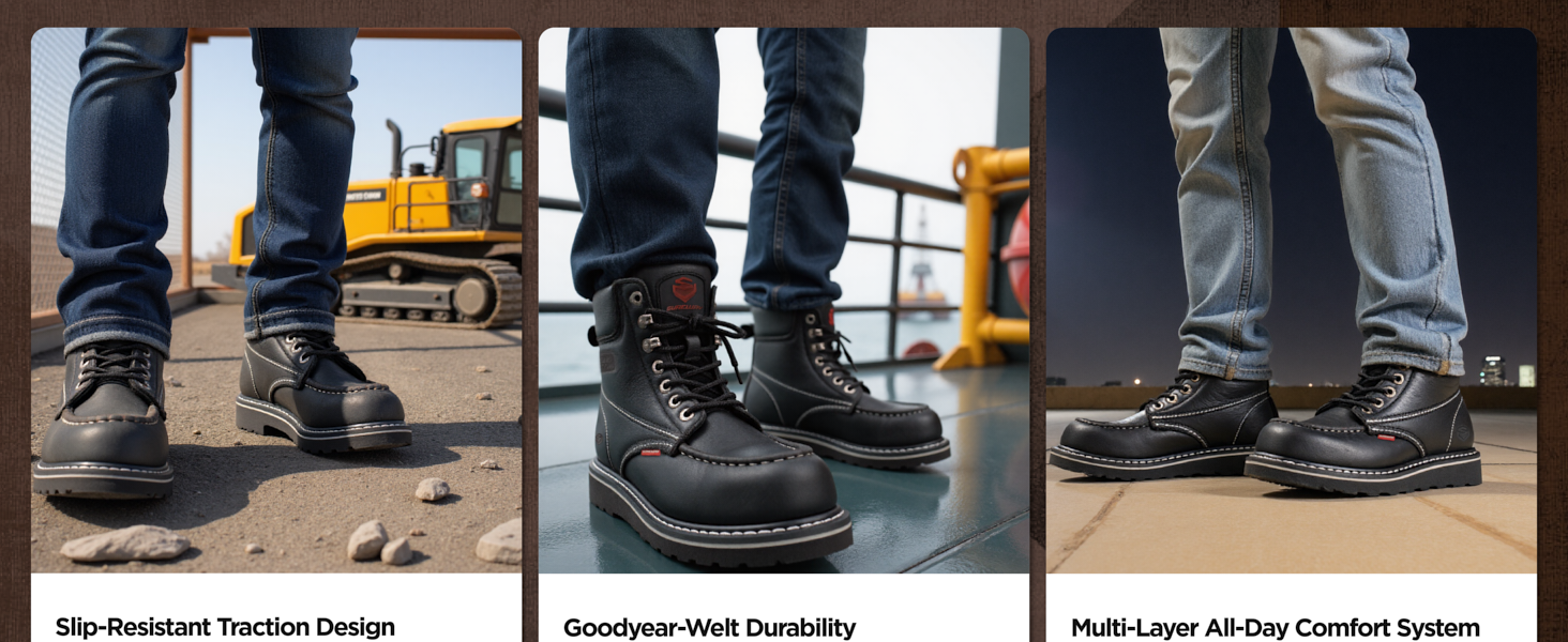 surewayworkboots are designed with safety features that protect your feet from various hazards commonly found in work environments: