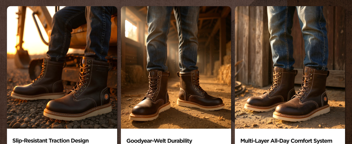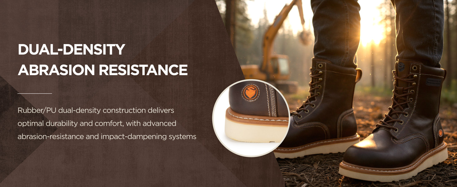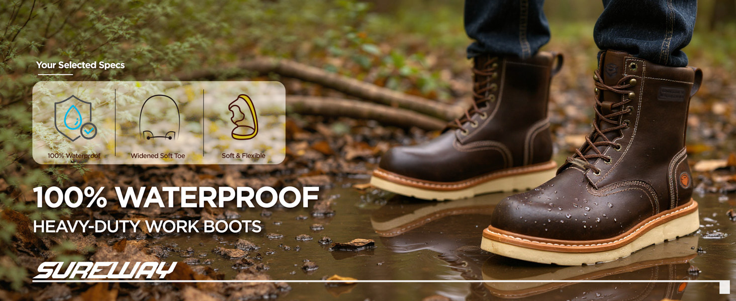 SUREWAY men's work boots use premium full-grain leather upper, perfect blend of strong and soft, makes the boots more resistant to hardening&cracking and hold their shape longer.